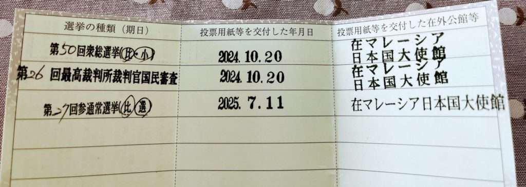 今回のマレーシア駐在では、去年やっと在外選挙証を取得しました。