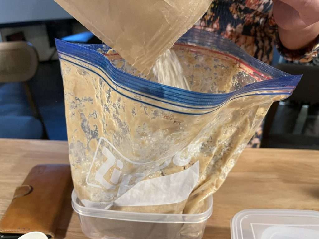 用意していただいたタッパーの中に、できたお味噌を入れます。