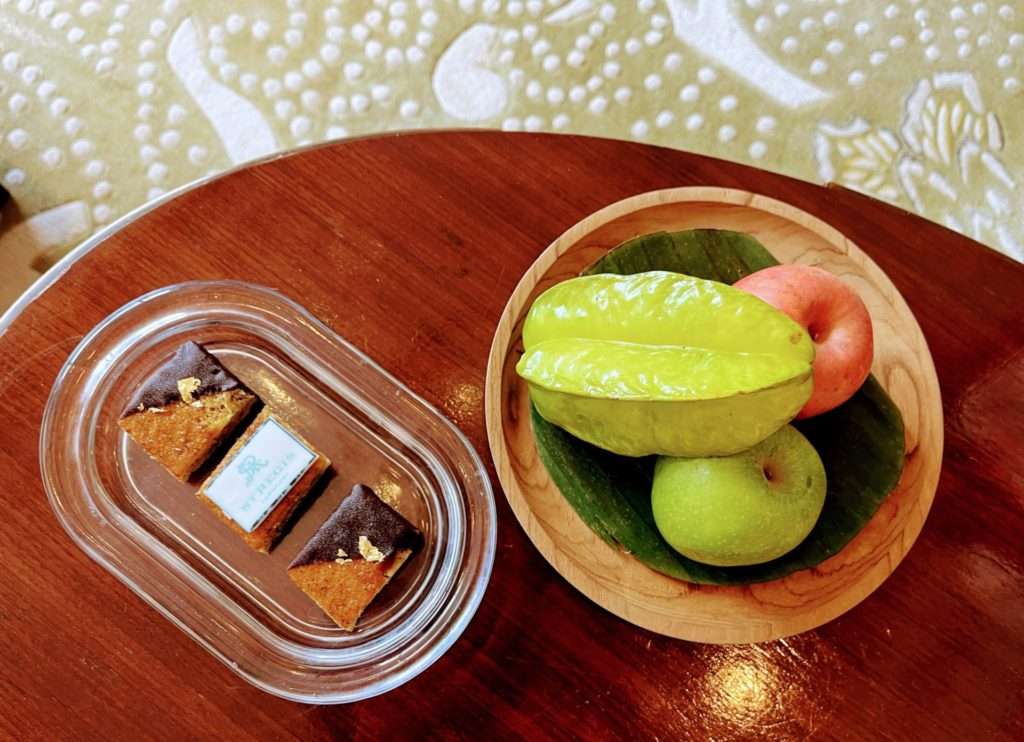 ウエルカムの果物とお菓子がテーブルに置いてありました。