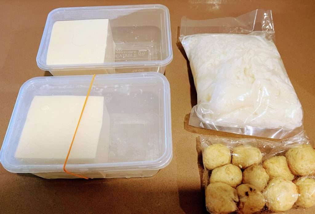まずは、こちらは、お豆腐屋さんで買って豆腐2丁とその向かいのお店で買ったフィッシュボールとクイティオ麺です。