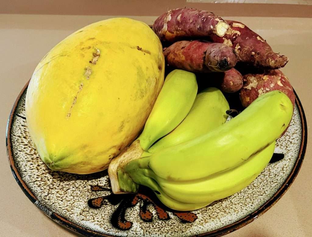 路上の屋台で、パパイヤとバナナとさつまいもをかいました。(さつまいもは、インドネシア産の日本のさつまいもだそうです。)