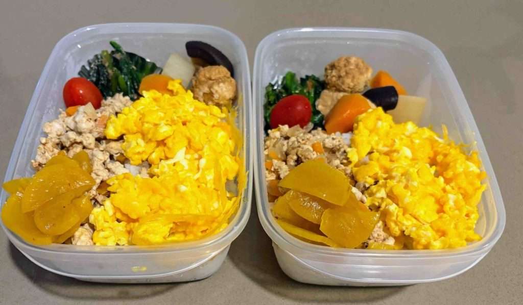 前日に作りおきしておいた鶏そぼろと大根やにんじんなどの煮物ほうれん草のおひたしを入れて、簡単お弁当をサクッと作りました。作るのに、10分もかかっていません 😄