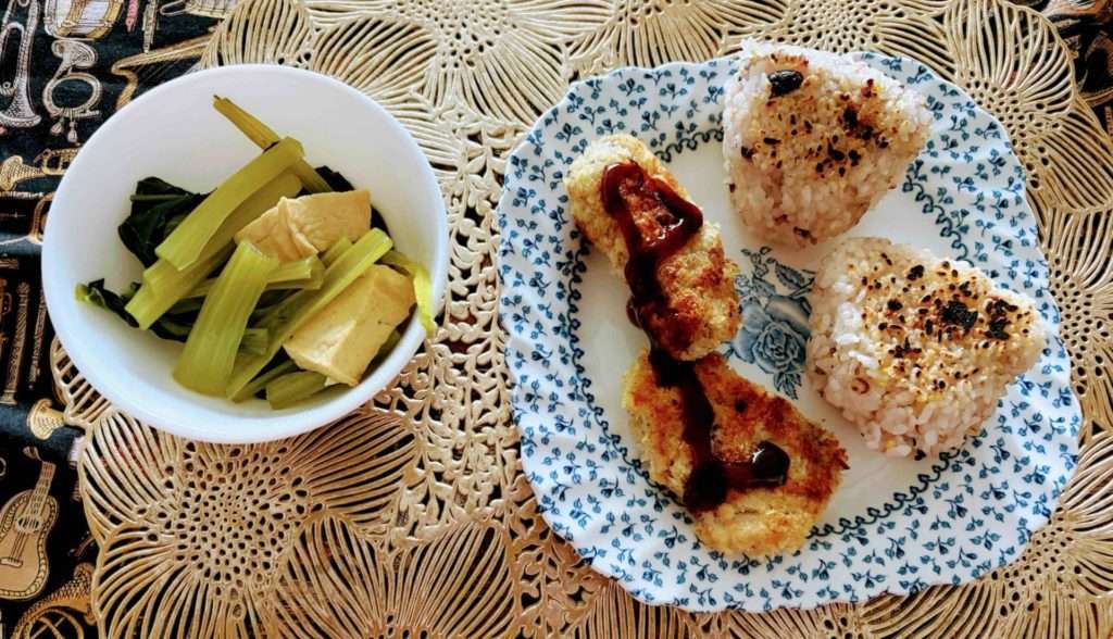 お弁当でない日の1人ランチでは、ウエットマーケットで買った揚げ豆腐を使って小松菜の煮びたしを作って、焼きおにぎりと残り物のトンカツといただきました。