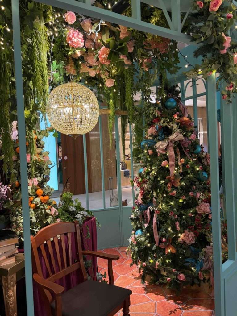 今年は、とても落ち着いた緑を基調としたデコレーションのようです。そこに落ち着いた色合いのピンクのリボンや花などが飾られています。