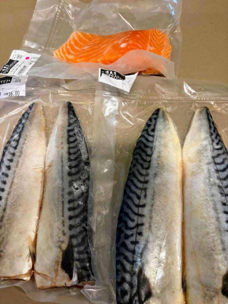 こちらは、サバとサーモンの冷凍です。お魚は、マレーシアでも高いです。