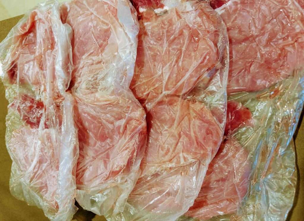 薄切りのお肉は、包丁で薄く切ってくれたあと、さらに袋に入れて上から肉叩きでトントンと叩いて薄くしてくれます。