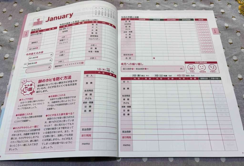 今までのレシートを貼る方式の家計簿はもう売り切れてなかったそうで、今年は違う内容です。