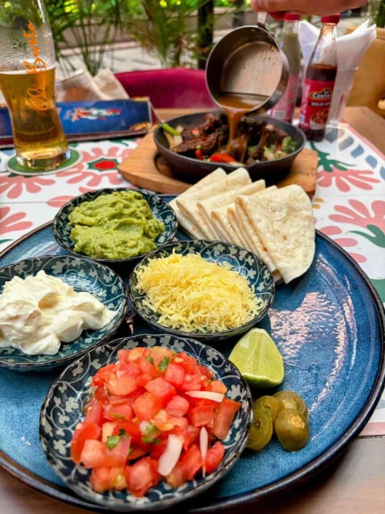 サワークリームやサルサ、チーズなどを乗せて、自分で巻いて食べるスタイルが特徴です。