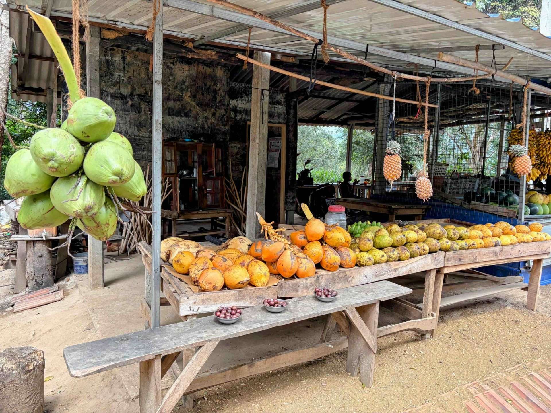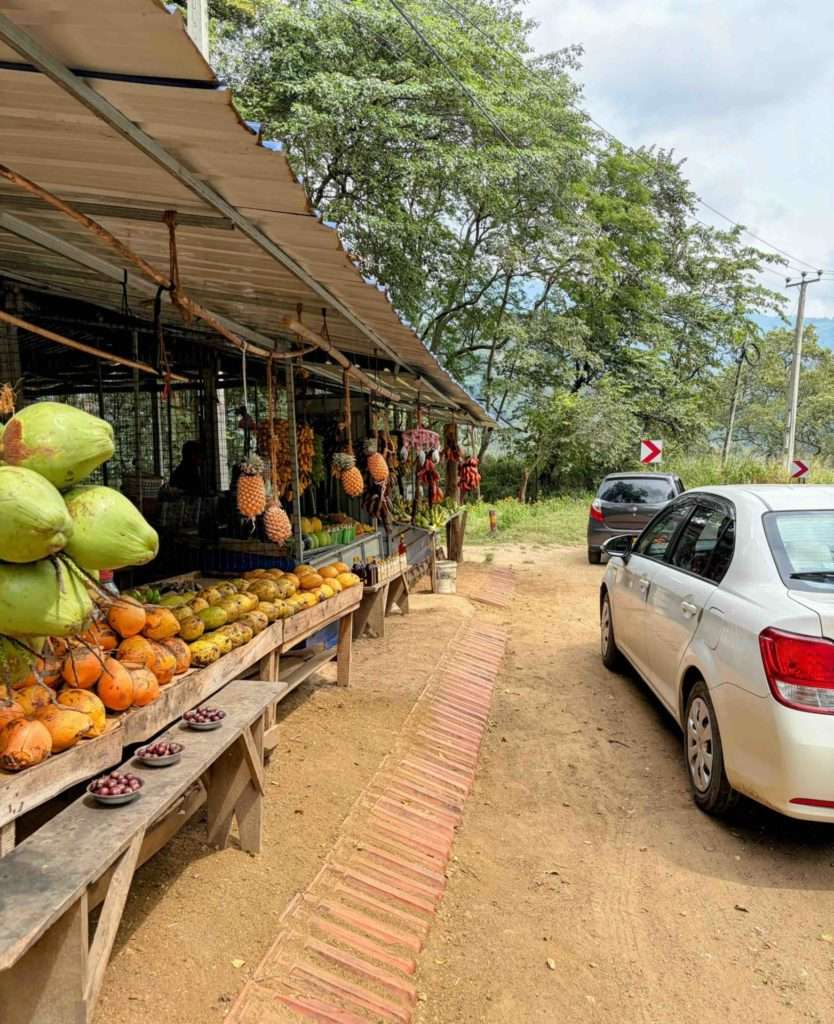 その先の道端で、ドライバーのディニッシュさんが車を停めてくださったのが、こちらの果物屋さんです。