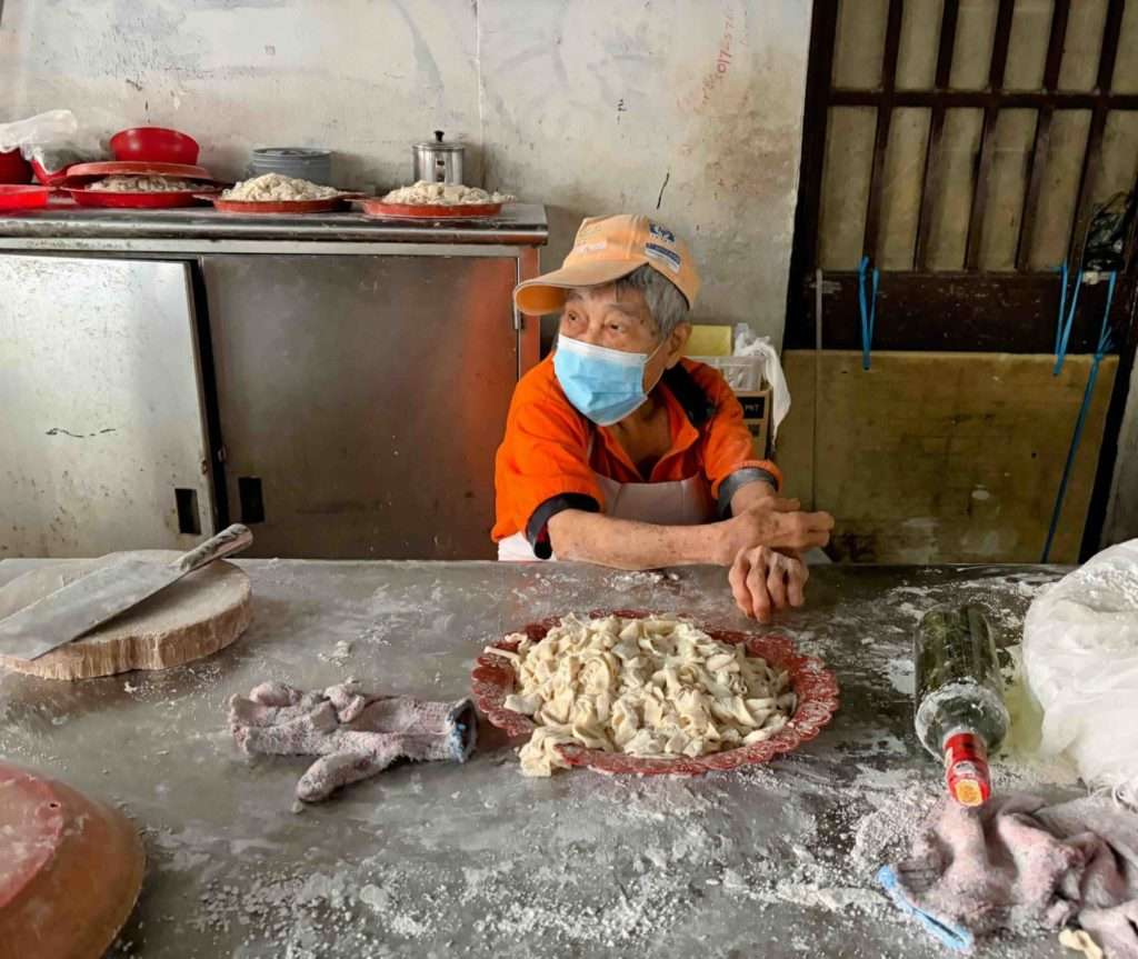 なんとキッチンのお隣では、おばあちゃんがパンミー(Pan Mee 板麺)の麺を作っているのです。(おばあちゃんに許可を得て、写真を撮らせていただきました。)