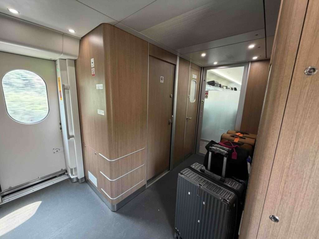 大きなスーツケース置き場はありませんので、このように廊下に置く感じになってしまうのが、ちょっと残念でした。(我が家は、機内持ち込み用の小さなスーツケース2つです。座席の上の棚に置くことができました。 )